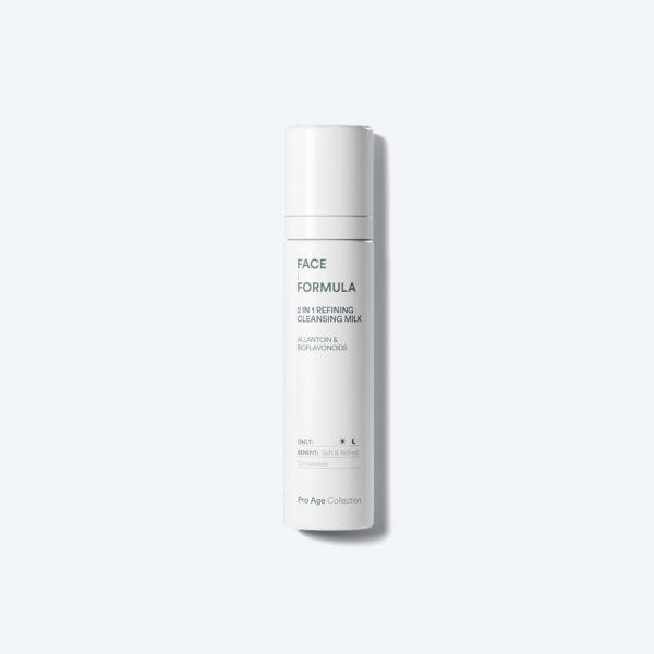 Face Formula 2 in 1 Refining Cleansing Milk er en unik, fuktighetsgivende rensemelk som renser porene for talg og i tillegg fjerner vannfast øyesminke. En lett og mild rens formulert med pro aging ingredienser. Virkestoffet Seboclear® sørger for at hudbarrieren og bakteriefloaren opprettholdes uten å tørke ut huden, i tillegg til å ha antibakterielle og betennelsesdempende egenskaper på akne. Unike Clear-Complex renser og virker oppstrammende på porer, og rensemelken har en beroligende og mykgjørenden effekt. Den passer for alle hudtyper, også de med svært sensitiv, inflammatorisk og hormonell hud.