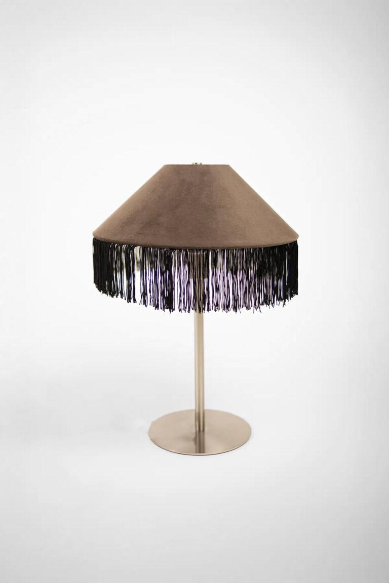 Bordlampe med elegante frynser og en stilren fot, inspirert av 1920-tallets art deco.