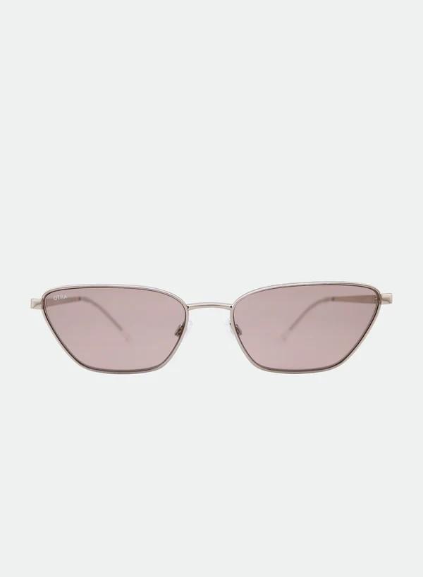 En unik trekantet solbrille med en metallinnfatning i elegant sølv, som gir et dristig og moderne geometrisk utseende. De myke rosa linsene gir et lekent, men sofistikert preg, og blander edgy design med subtil eleganse.