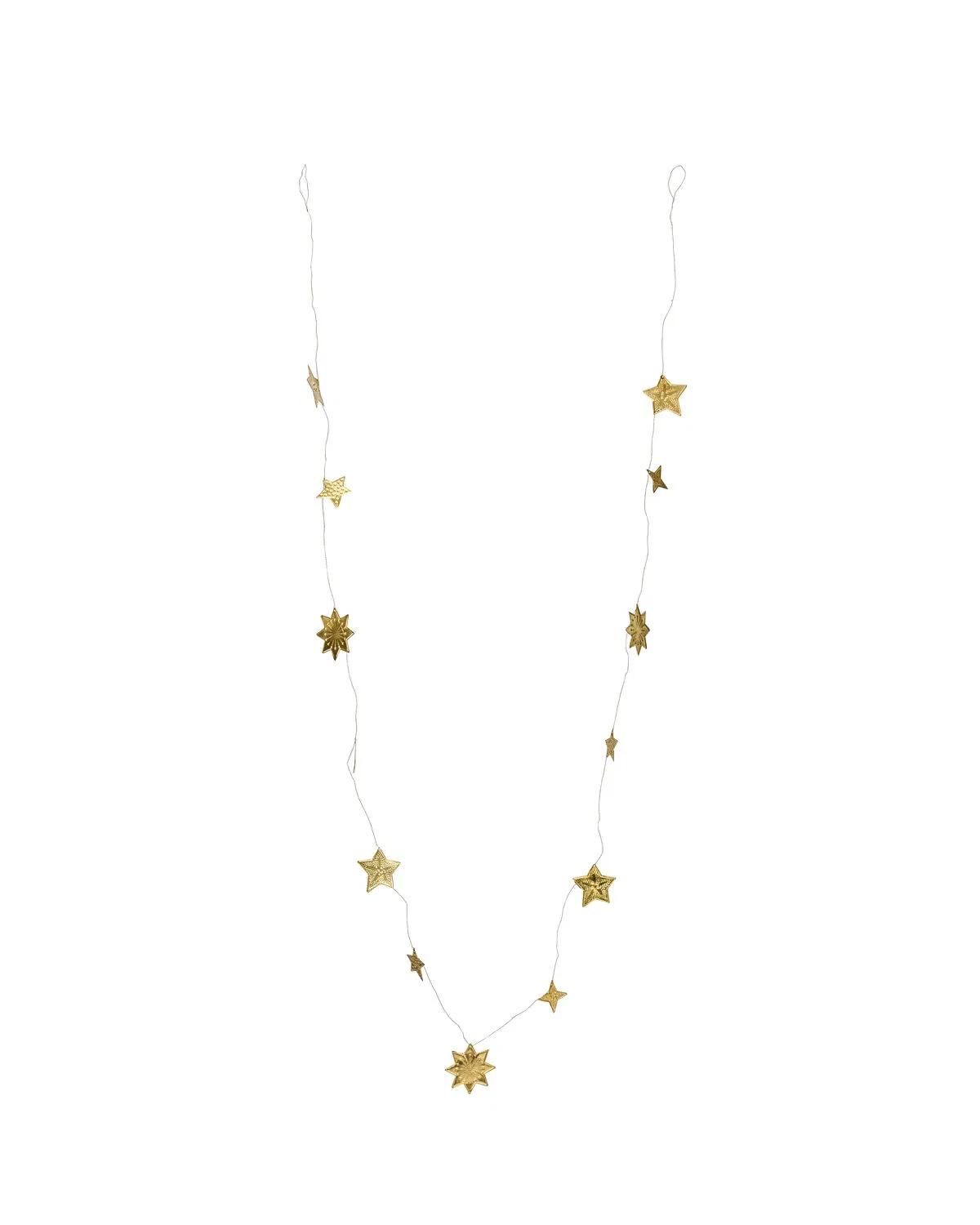Denne lette girlanden har en kjede av stjerner laget av messing og jern med antikk messingfinish. Dens skulpturelle design tilfører subtile detaljer til vegger, vinduer eller festlige grener.