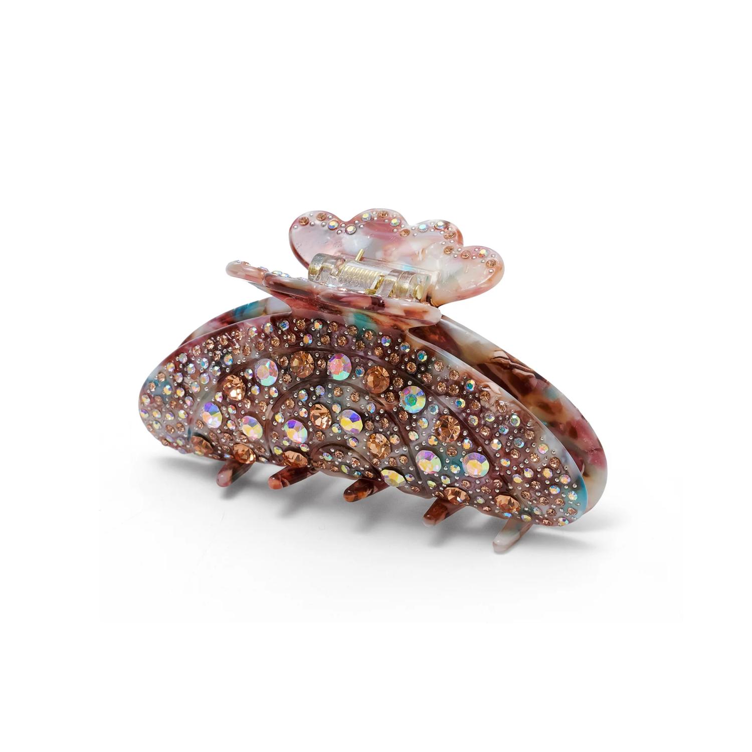 Klypen er laget av høykvalitets resin (akryl), et materiale kjent for sin lette vekt og holdbarhet. Klypen er vakkert dekorert med håndlimte stener. Resinmaterialet er lett, noe som betyr at klypen holder håret ditt på plass uten å tynge eller skape ubehag.