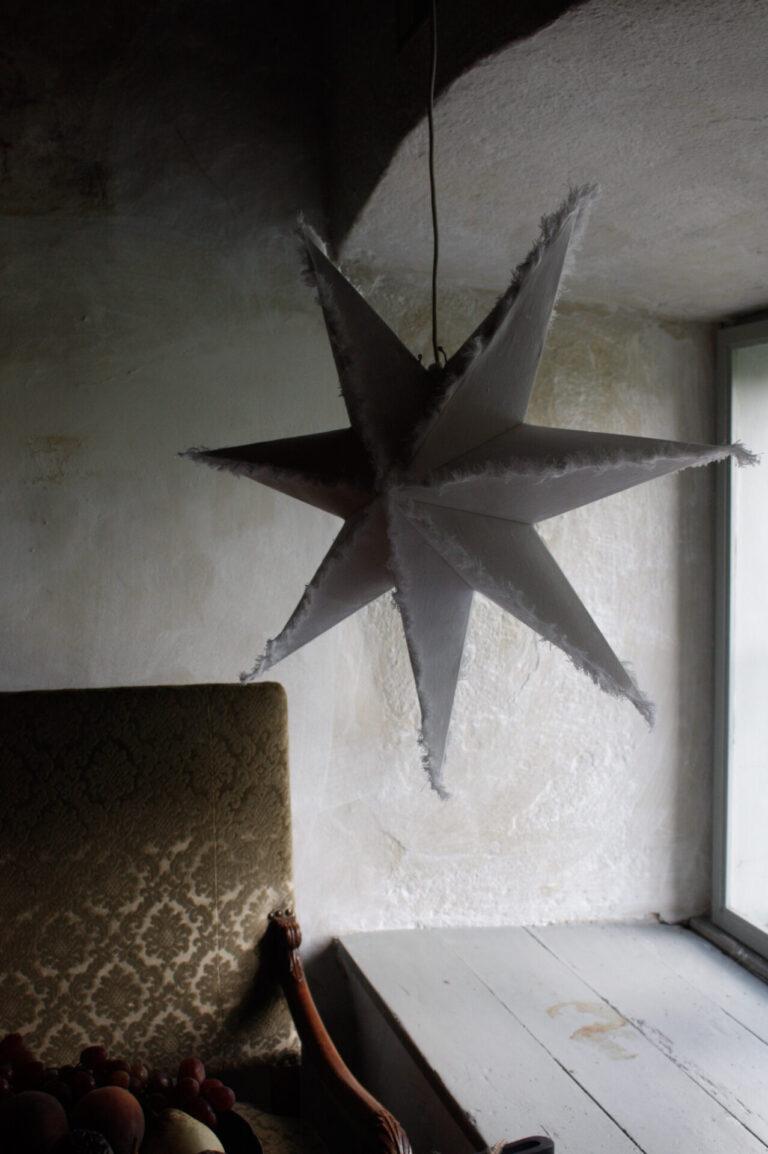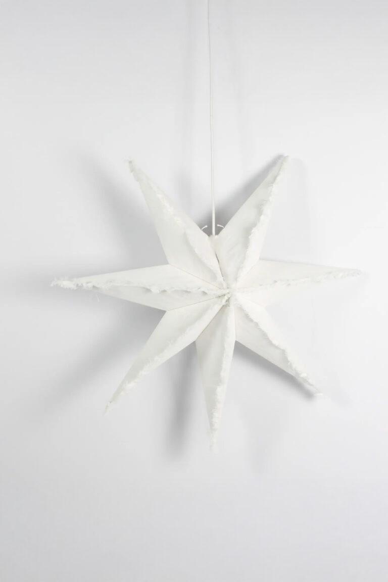 En vakker adventsstjerne i et unikt design. Kantene er omgitt av frynser fra linstoffet som gir en varm og koselig følelse. Stofftilkoblingskabel og lampebrakett med E14-sokkel er inkludert.