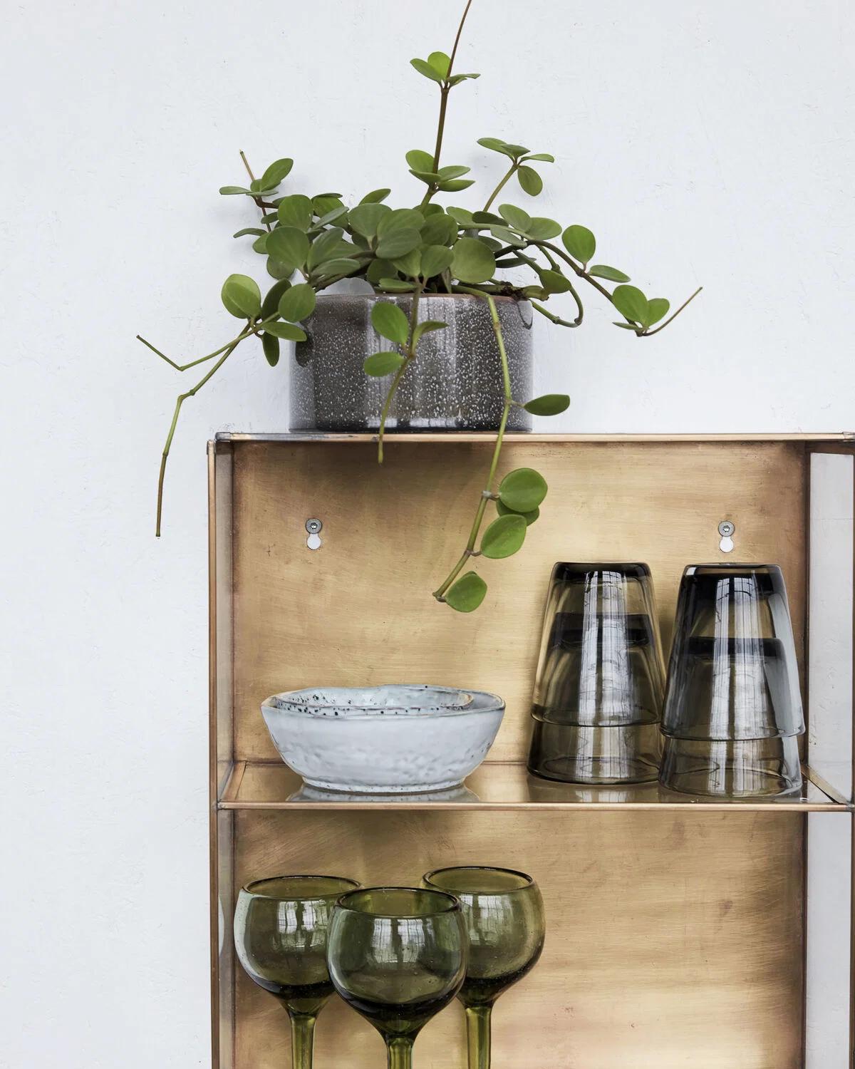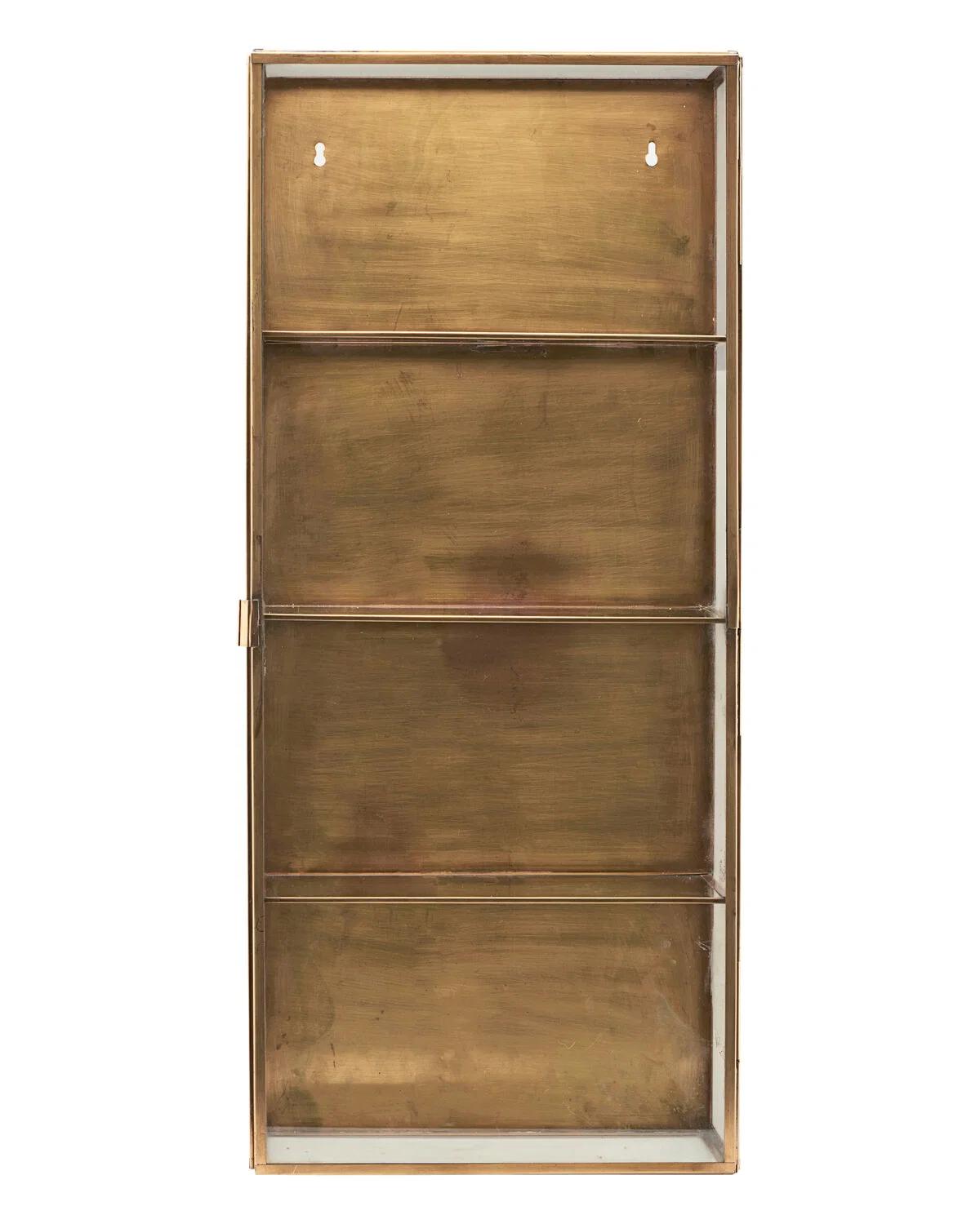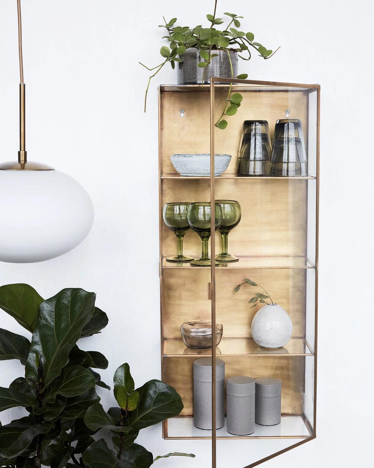 Skap personlig, visuell tiltrekning i hjemmet ditt. Med Glass fra House Doctor får du et skap laget for å henge på veggen. Den er laget av glass og messing. Skapet kommer med glassdør, messingbakside og tre hyller som lett kan rengjøres med en tørr klut. Den vakre messingbaksiden vil definitivt skille seg ut i ethvert hjem, da den tilfører mye personlighet til ethvert hjem. Bruk dette skapet til å vise frem dine mest verdsatte småting og andre små dekorative gjenstander. Eller bruk den på kjøkkenet til å vise frem kjølige krydderkrukker eller vinglass.