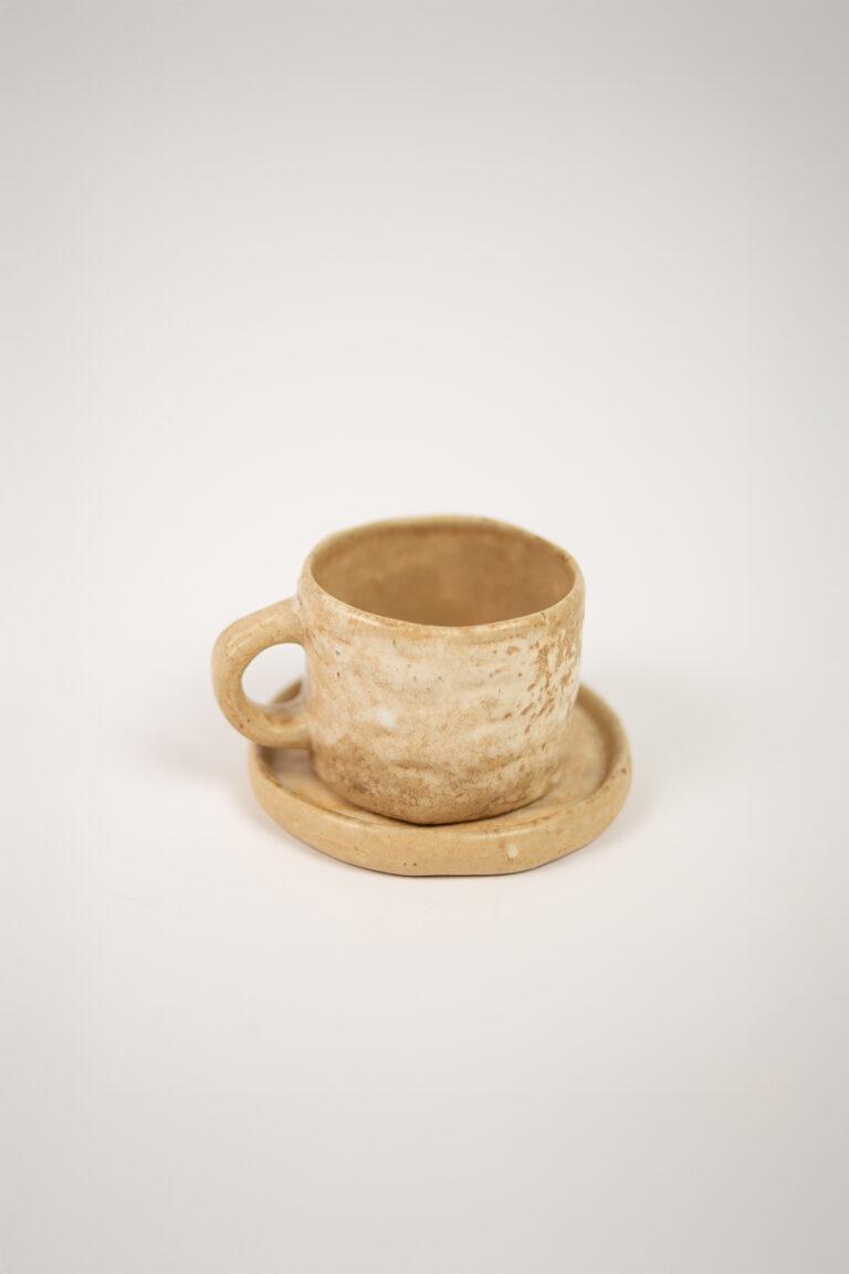 Kopp med skål i steintøy, glasert med en reaktiv glasur som gir unike skift i farge og finish.
