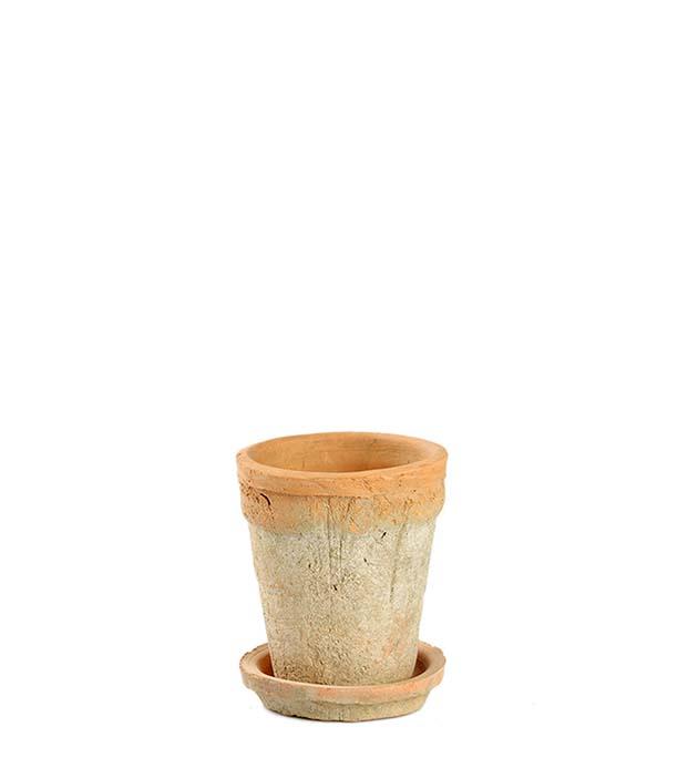 Rustikk terracotta krukke med underskål.