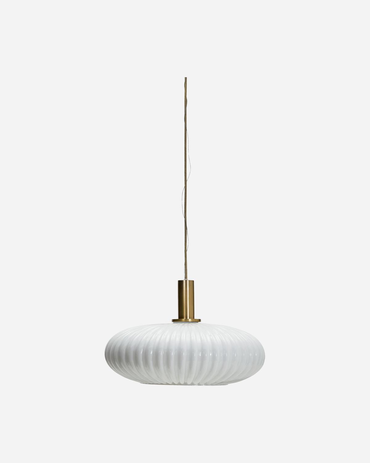 En pendellampe i offwhite glass med elegant, rillet finish kaster et behagelig og dekorativt lys over spisebordet, stuen eller i entreen. Den håndlagde glasskjermen gir et stilrent uttrykk, mens detaljer i antikk messing fremhever det eksklusive preget.