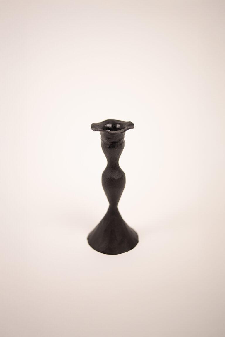Rustikk lysestake i svart metall med hamret overflate og myke, organiske former. Passer til lysekroner og kan enkelt kombineres med andre lysestaker.