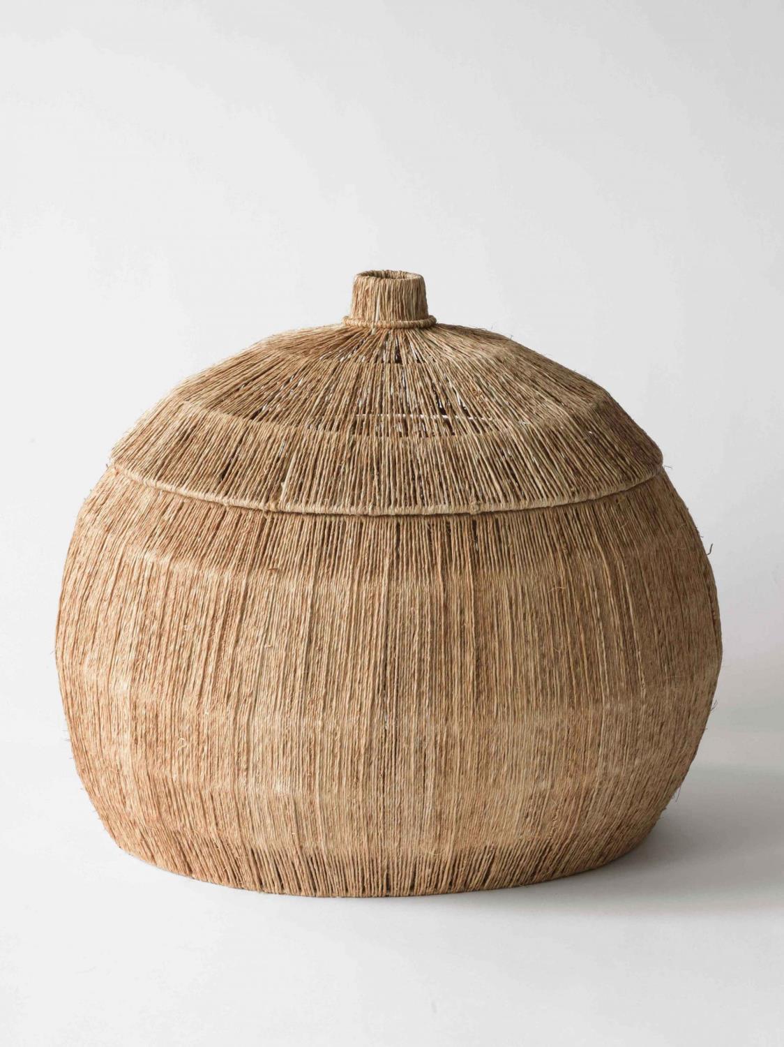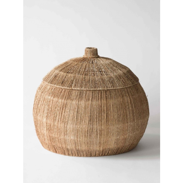 Håndlaget kurv med lokk. Kurven er laget av naturlig materiale jute som er flettet tett rundt en metallramme, med en base laget av rotting som gir kurven stabilitet. Perfekt å bruke som oppbevaring eller som et vakkert stilleben.