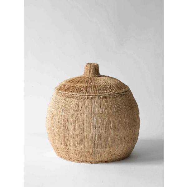 Håndlaget kurv med lokk. Kurven er laget av naturlig materiale jute som er flettet tett rundt en metallramme, med en base laget av rotting som gir kurven stabilitet. Perfekt å bruke som oppbevaring eller som et vakkert stilleben.