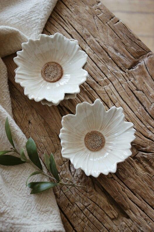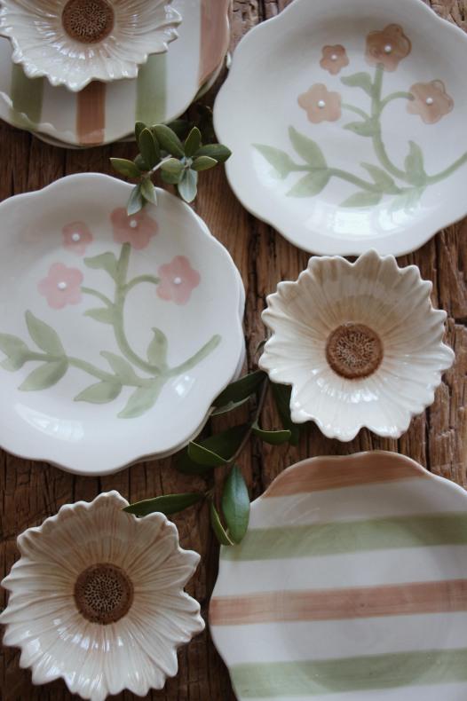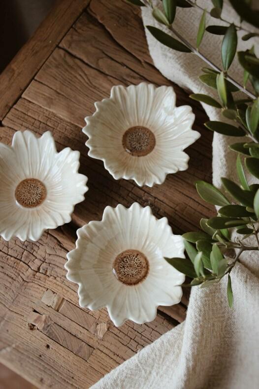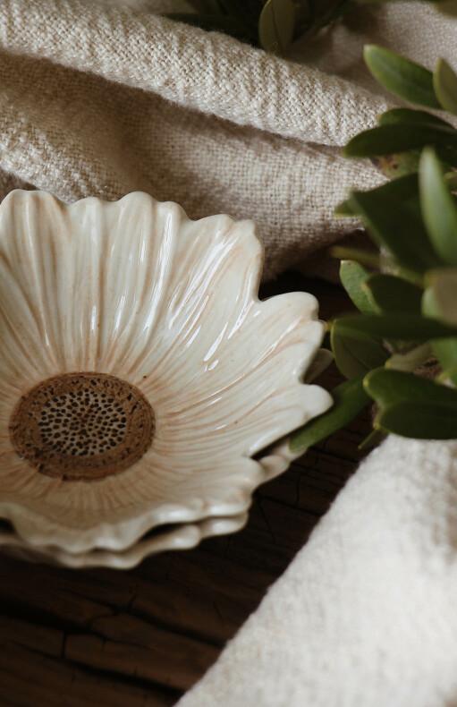 Nydelig skål i form av en blomst med et håndmalt mønster i taupe og brunt.