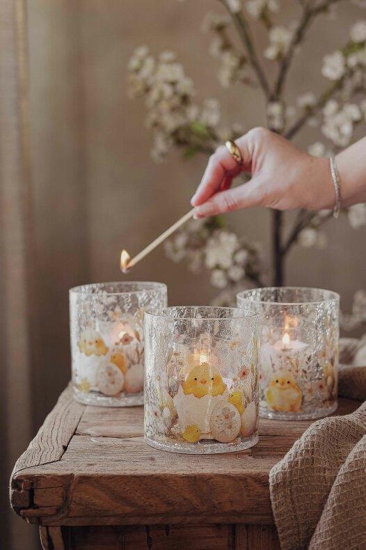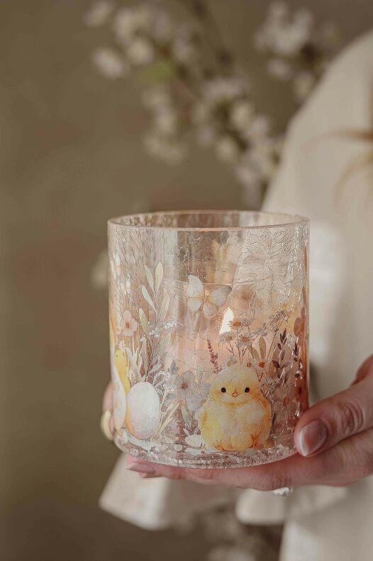 Finish Håndlaget spratt glasslykt med mønster av søte påskekyllinger og blomster.