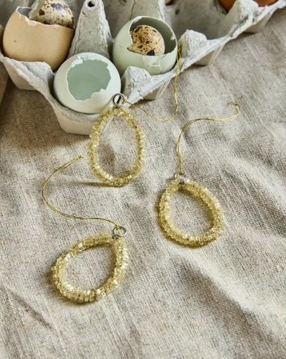Tre perlebesatte eggformede ornamenter i en myk champagnefarge. Det teksturerte perlearbeidet gir en detaljert overflatestruktur for dekorativ henging på knoppende grener eller som en del av et midtpunkt.