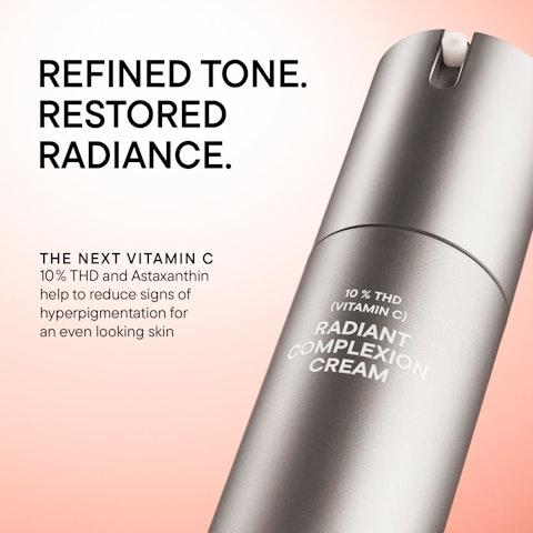 Radiant Complexion Cream er en avansert antioksidantkrem med 10 % stabil THD-vitamin C – en svært effektiv form for C-vitamin kjent for å forbedre hudens glød og struktur. Denne kremen er utviklet for profesjonell hudpleie og passer perfekt for kunder som ønsker å bekjempe tidlige aldringstegn og ujevn hudtone. I kombinasjon med et kraftfullt antioksidantkompleks bestående av astaxanthin, glutation og vitamin E, styrker den hudens naturlige forsvar mot frie radikaler og miljøbetinget aldring. Resultatet er en jevnere, klarere og mer vital hud med synlig forbedret utstråling.