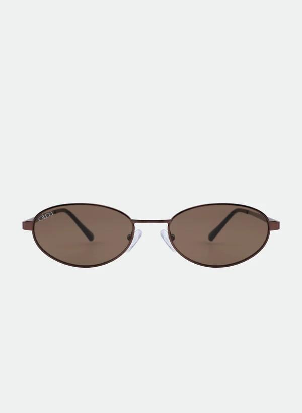 Møt ROSIE, vår versjon av den klassiske ovale solbrillen, gjenskapt i en varm sjokoladefarget metallinnfatning med myke brune linser.