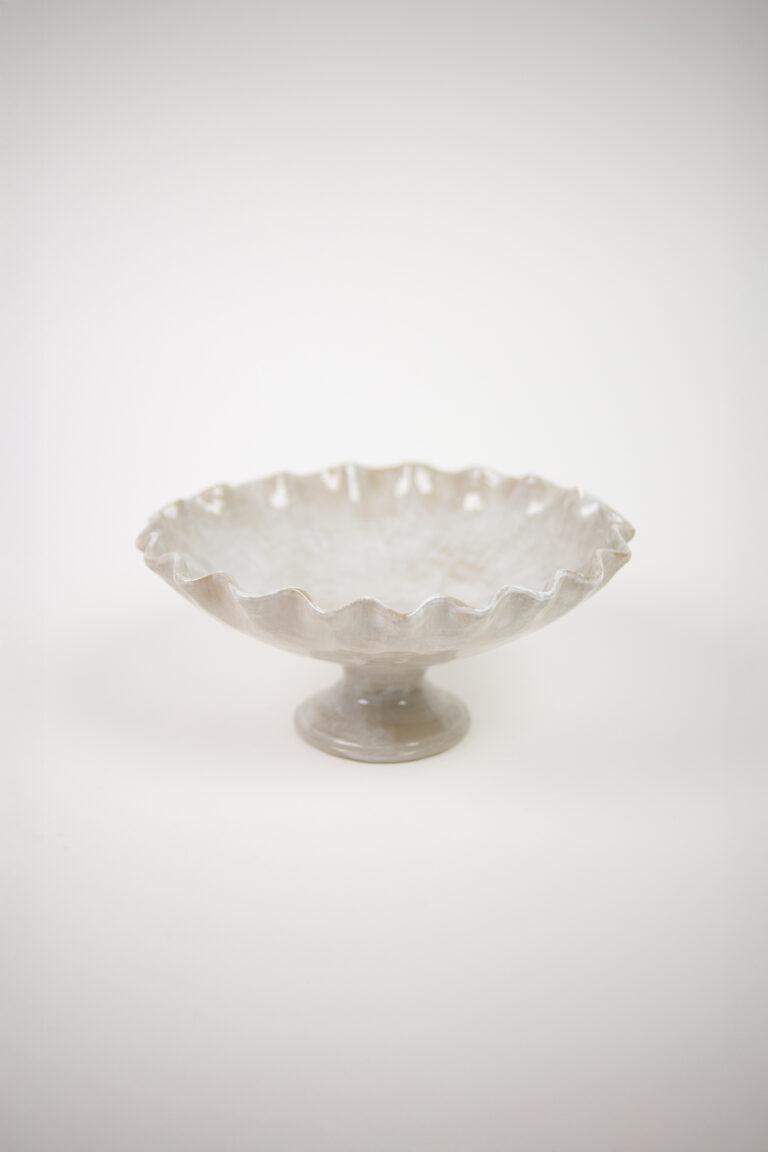 Vakker serveringsskål med bølget kant og blank overflate.