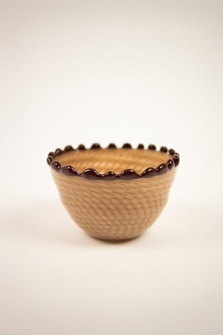 Leken skål med dekorative prikker langs kanten. En enkel, men vakker bolle, ideell for servering av små snacks.